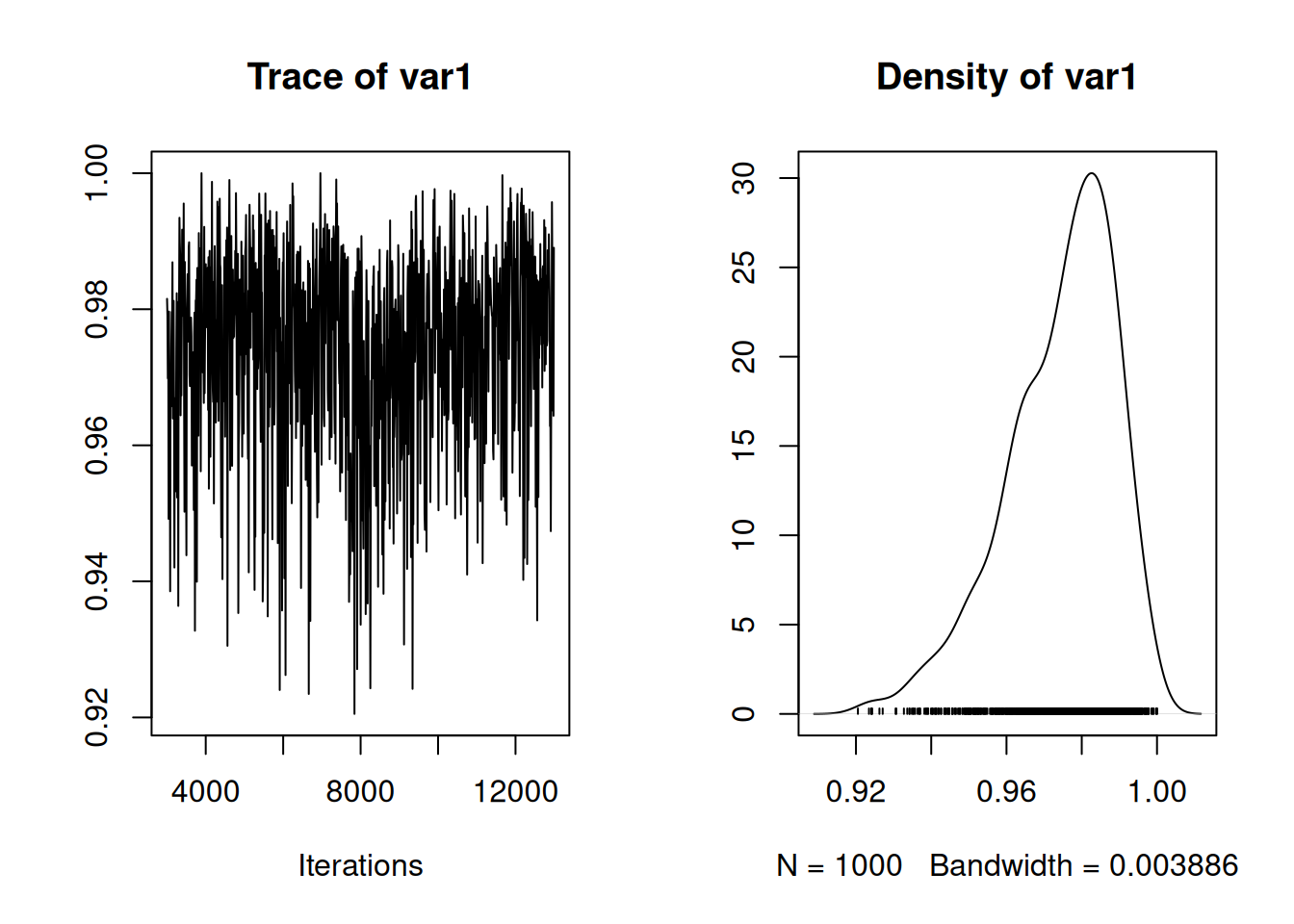 and we can see that 0.95 has some support but much of the posterior density is above this and the posterior mean is 0.974. As we saw from model \(\texttt{m.meta2}\), the best estimate is that the measurement error variance scales by a factor 0.755 with the reported measurement error variance, \(\texttt{vi}\). Since the reported measurement error variance may be inflated the assumed confidence level may have been deflated and the actual level may exceed 95%.
