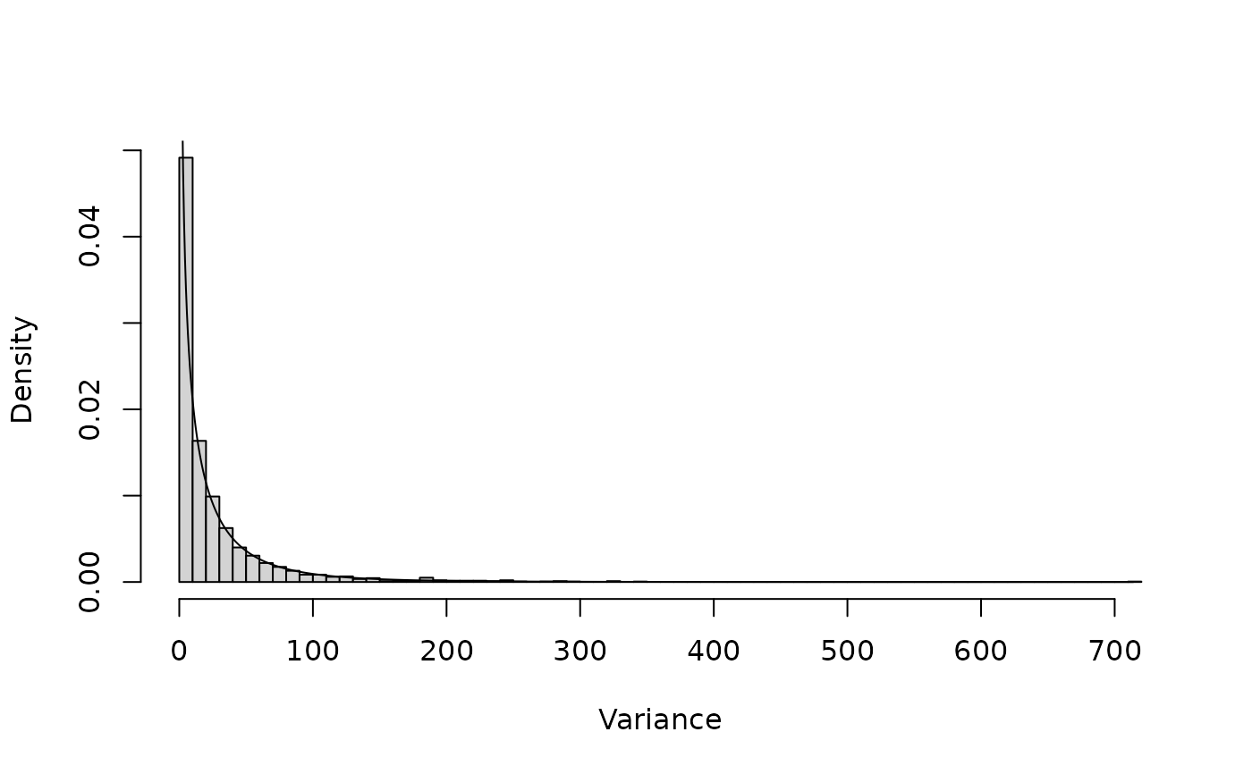 hist(V[,1], freq=FALSE, breaks=100, main="", xlab="Variance")